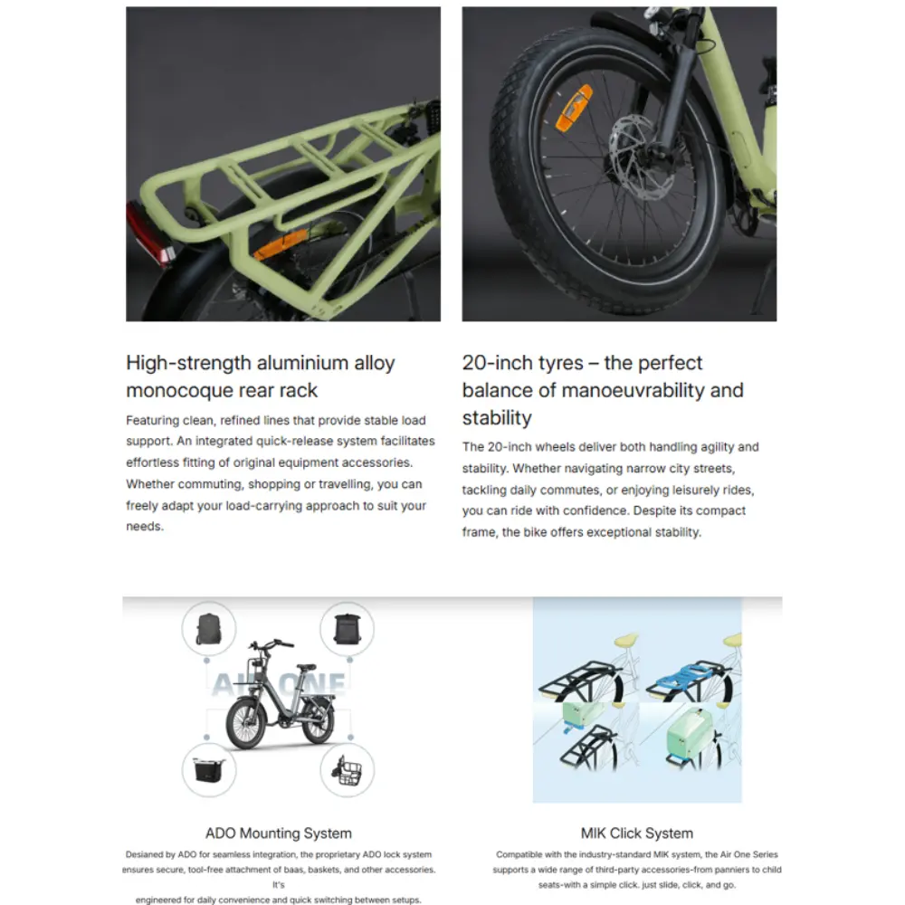 Το ADO Air One Pro Ηλεκτρικό Ποδήλατο είναι ένα ευέλικτο,ηλεκτρικό ποδήλατο για όλες τις χρήσεις, σχεδιασμένο για να αναβαθμίζει την καθημερινή κινητικότητα με άνεση, ισχύ και έξυπνη τεχνολογία. Κατασκευασμένο για μετακινήσεις στην πόλη, περιπέτειες το Σαββατοκύριακο, σχολικές αποδράσεις, ακόμη και για ελαφριές ανάγκες μεταφοράς φορτίων, έχεισχεδιαστεί για να προσαρμόζεται αβίαστα σε κάθε σενάριο. Με το ελαφρύ σκελετό του και τη συμπαγή γεωμετρία του, το Air One προσφέρει εξαιρετική ευελιξία χωρίς συμβιβασμούς στη σταθερότητα, καθιστώντας το ιδανικό τόσο για αστικούς δρόμους όσο και για μονοπάτια στην εξοχή. Εξοπλισμένο με μια αποτελεσματική μπαταρία ενσωματωμένη στη σέλα, το ADO Air One προσφέρει έως και 100 χλμ. υποβοηθούμενης αυτονομίας, εξασφαλίζοντας μεγάλες,ξέγνοιαστες βόλτες. Το καινοτόμο αυτόματο εσωτερικό σύστημα αυτόματων ταχυτήτων 2 σχέσεων προσαρμόζεται άψογα στον ρυθμό σας, ενώ η κίνηση με ιμάντα από ανθρακονήματα προσφέρει μια ομαλή, αθόρυβη και χωρίς συντήρησηεμπειρία. Οι αναβάτες επωφελούνται επίσης από έναν αισθητήρα ροπής για φυσική υποστήριξη πεταλίσματος, μια οθόνη IPS ‑ευανάγνωστη στο ηλιακό φως και συμβατότητα με την εφαρμογή ADO Smart για πλοήγηση και δεδομένα οδήγησης. Σχεδιασμένο για πρακτικότητα, το Air One διαθέτει πτυσσόμενο τιμόνι για εύκολη αποθήκευση, μια στιβαρή πίσω σχάρα και συμβατότητα με αξεσουάρ MIK. Το ADO Air One Pro προσφέρει αξιοπιστία, άνεση και πρωτοποριακή καινοτομία στα ηλεκτρικά ποδήλατα σε ένα κομψό πακέτο, είτε μετακινείστε, είτε ψωνίζετε, είτε εξερευνάτε.