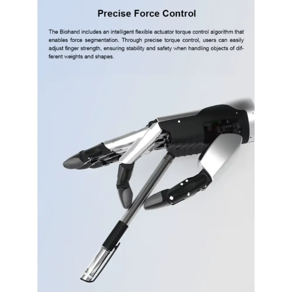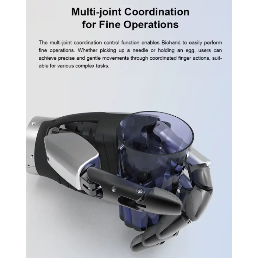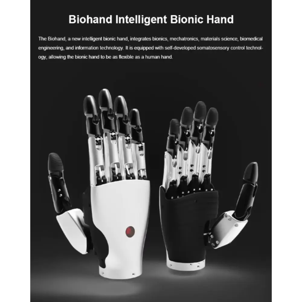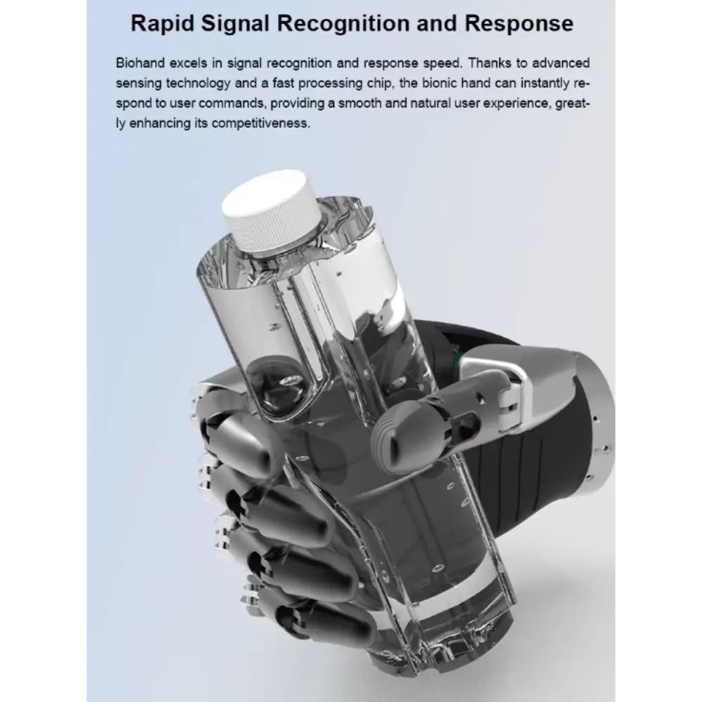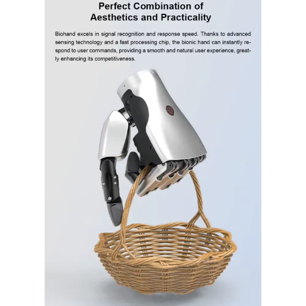 Το Biohand – Έξυπνο Προσθετικό Ρομποτικό Χέρι είναι μια πρωτοποριακή καινοτομία που έχει σχεδιαστεί για να αποκαθιστά τη λειτουργικότητα και να βελτιώνει την ποιότητα ζωής για άτομα με απώλεια άνω άκρων. Αυτό το προηγμένο προσθετικό χέρι συνδυάζει τεχνολογία αιχμής με κομψό, εργονομικό σχεδιασμό για να μιμείται τις φυσικές κινήσεις και την εμφάνιση. Το Biohand υπερέχει στην αναγνώριση σήματος και στην ταχύτητα απόκρισης. Χάρη στην προηγμένη τεχνολογία ανίχνευσης και ένα τσιπ γρήγορης επεξεργασίας, το βιονικό χέρι μπορεί να ανταποκριθεί άμεσα στις εντολές του χρήστη, παρέχοντας μια ομαλή και φυσική εμπειρία χρήστη και ενισχύοντας σημαντικά την ανταγωνιστικότητά του. Εξοπλισμένο με τεχνολογία άρθρωσης πολλαπλών αρθρώσεων και προσαρμοστική λαβή, επιτρέπει ένα ευρύ φάσμα εργασιών, από το κράτημα ευαίσθητων αντικειμένων μέχρι το κράτημα βαρύτερων αντικειμένων με ασφάλεια. Το προσθετικό διαθέτει ευαίσθητους αισθητήρες που επιτρέπουν ακριβή έλεγχο. Η ελαφριά κατασκευή του εξασφαλίζει άνεση κατά την παρατεταμένη χρήση, ενώ τα ανθεκτικά υλικά εγγυώνται μακροχρόνια απόδοση. Το διαισθητικό σύστημα ελέγχου του χεριού το καθιστά φιλικό προς το χρήστη και εξαιρετικά λειτουργικό. Το Biohand γεφυρώνει το χάσμα μεταξύ της ανθρώπινης ικανότητας και της ρομποτικής ακρίβειας, δίνοντας τη δυνατότητα στους χρήστες να ανακτήσουν την ανεξαρτησία και την εμπιστοσύνη στην καθημερινή τους ζωή.