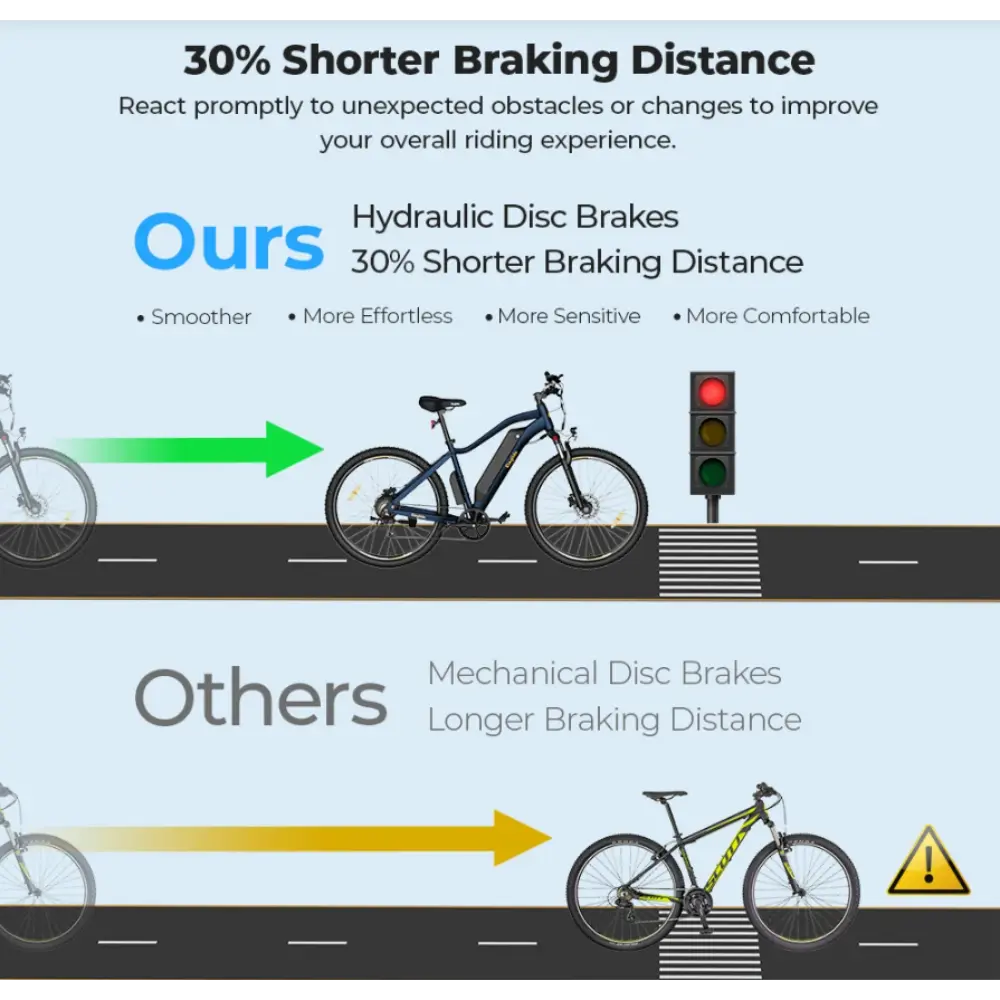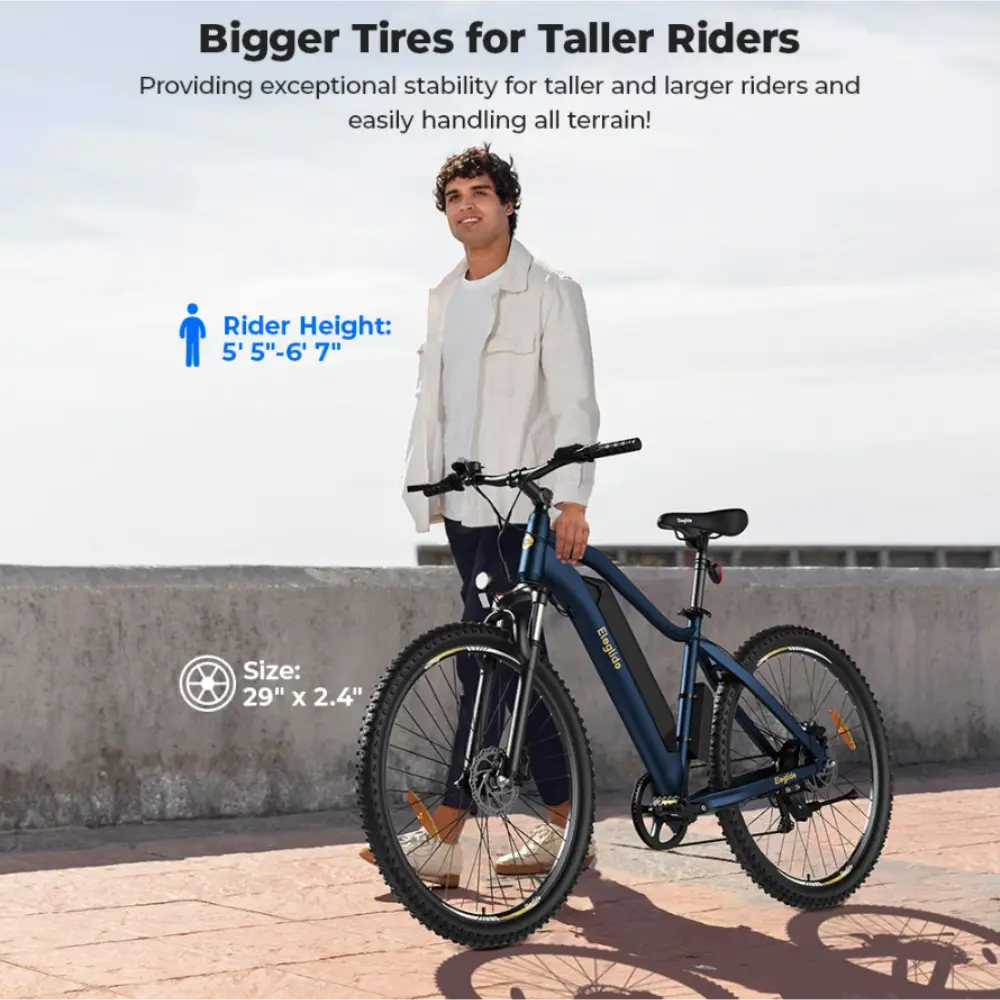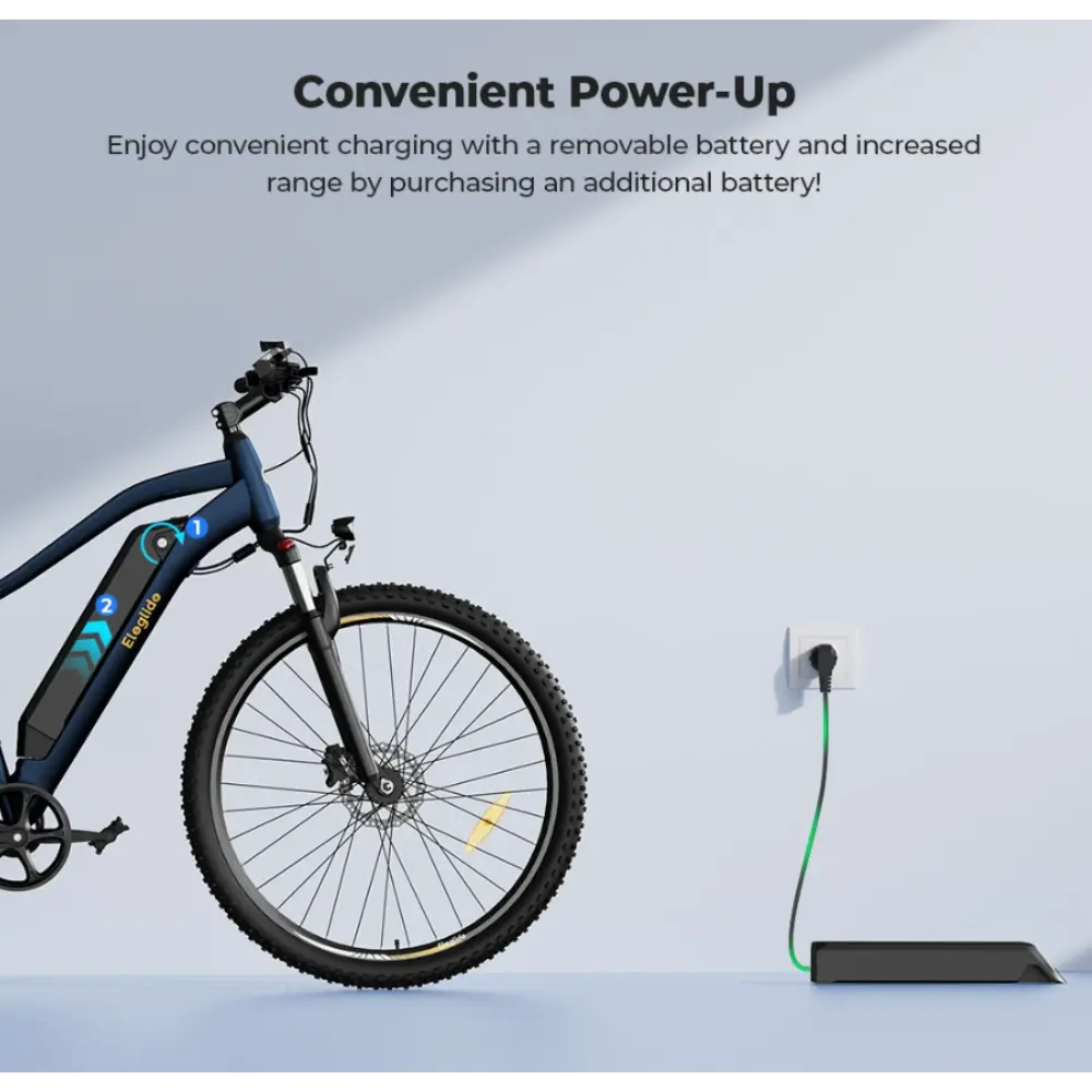 Το Eleglide Mopride 3 Ηλεκτρικό Ποδήλατο Βουνού είναι ένα στιβαρό ηλεκτρικό ποδήλατο βουνού σχεδιασμένο για αναβάτες που αγαπούν την περιπέτεια και αναζητούν δύναμη, άνεση και ευελιξία. Κατασκευασμένο με αθλητικό πλαίσιο από κράμα αλουμινίου, το Mopride 3 είναι προσαρμοσμένο για αναβάτες άνω των 175 εκ., προσφέροντας φυσική στάση σώματος και ευέλικτο χειρισμό σε ποικίλα εδάφη. Διαθέτει ελαστικά βουνού με αέρα 29”x 2,4” και πιρούνι ανάρτησης με δυνατότητα κλειδώματος 80 χλστ, εξασφαλίζοντας σταθερότητα και απορρόφηση κραδασμών σε ανώμαλα μονοπάτια. Τροφοδοτείται από έναν κινητήρα πλήμνης 250W με ροπή 50Nm, προσφέρει ομαλή απόδοση υποβοήθησης πεντάλ σε πέντε επίπεδα ταχύτητας, με μέγιστη ταχύτητα 25 χλμ/ω. Η μπαταρία 48V 12Ah παρέχει έως και 120 χλμ αυτονομία υπό βέλτιστες συνθήκες και επαναφορτίζεται σε περίπου 6 ώρες. Η ασφάλεια ενισχύεται από υδραυλικά δισκόφρενα και σύστημα ηλεκτρονικού φρένου, ενώ ένας εκτροχιαστής Shimano 7 ταχυτήτων προσθέτει μηχανική ευελιξία. Η οθόνη LCD 2,6 ιντσών προσφέρει δεδομένα σε πραγματικό χρόνο και η αδιάβροχη βαθμολογία IPX4 εξασφαλίζει ανθεκτικότητα σε ελαφριά βροχή. Ιδανικό για μετακινήσεις, εξερεύνηση εκτός δρόμου ή βόλτες με γυμναστική, το Mopride 3 συνδυάζει την απόδοση με την πρακτικότητα