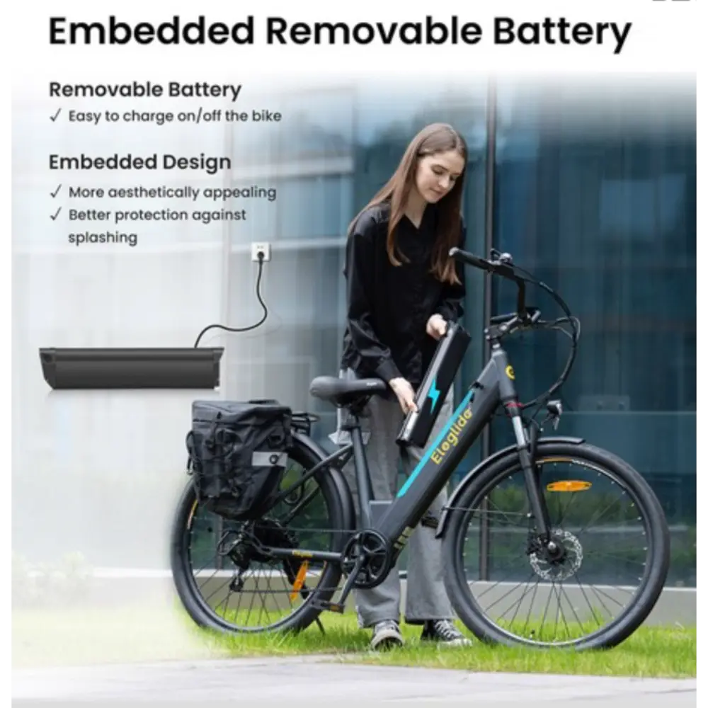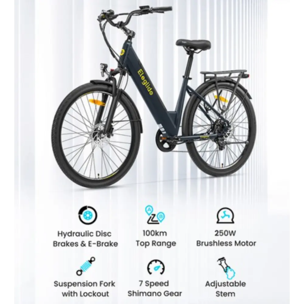 Το Eleglide T2 Ηλεκτρικό Ποδήλατο Trekking είναι ένα ευέλικτο και άρτια εξοπλισμένο ηλεκτρικό ποδήλατο πεζοπορίας σχεδιασμένο τόσο για μετακινήσεις όσο και για αναψυχή. Τροφοδοτείται από έναν κινητήρα χωρίς ψήκτρες 250W και μια μπαταρία λιθίου 36V 13Ah, προσφέρει μέγιστη ταχύτητα 25 km/h και μέγιστη αυτονομία έως και 100 km με μία μόνο φόρτιση, ανάλογα με τις συνθήκες οδήγησης. Οι τροχοί 27,5 ιντσών με ελαστικά 2,1 ιντσών προσφέρουν σταθερή και άνετη οδήγηση σε διάφορα εδάφη, ενώ τα υδραυλικά δισκόφρενα εξασφαλίζουν αξιόπιστη ισχύ ακινητοποίησης σε όλες τις καιρικές συνθήκες. Το ποδήλατο διαθέτει πιρούνι ανάρτησης με κλείδωμα, επιτρέποντας στους αναβάτες να εναλλάσσονται μεταξύ άνεσης και απόδοσης ανάλογα με το έδαφος. Είναι εξοπλισμένο με σύστημα ταχυτήτων Shimano 7 ταχυτήτων για ομαλή αλλαγή ταχυτήτων και καλύτερο έλεγχο. Η ενσωματωμένη οθόνη LCD εμφανίζει δεδομένα σε πραγματικό χρόνο, όπως ταχύτητα, επίπεδο μπαταρίας και λειτουργία οδήγησης, ενώ το ποδήλατο υποστηρίζει επίσης έλεγχο μέσω εφαρμογής για βελτιωμένη προσαρμογή. Με το κομψό πλαίσιο, τον εργονομικό σχεδιασμό και τα πρακτικά χαρακτηριστικά του, το Eleglide T2 αποτελεί μια αξιόπιστη επιλογή για αναβάτες με οικολογική συνείδηση ​​που αναζητούν απόδοση και άνεση.