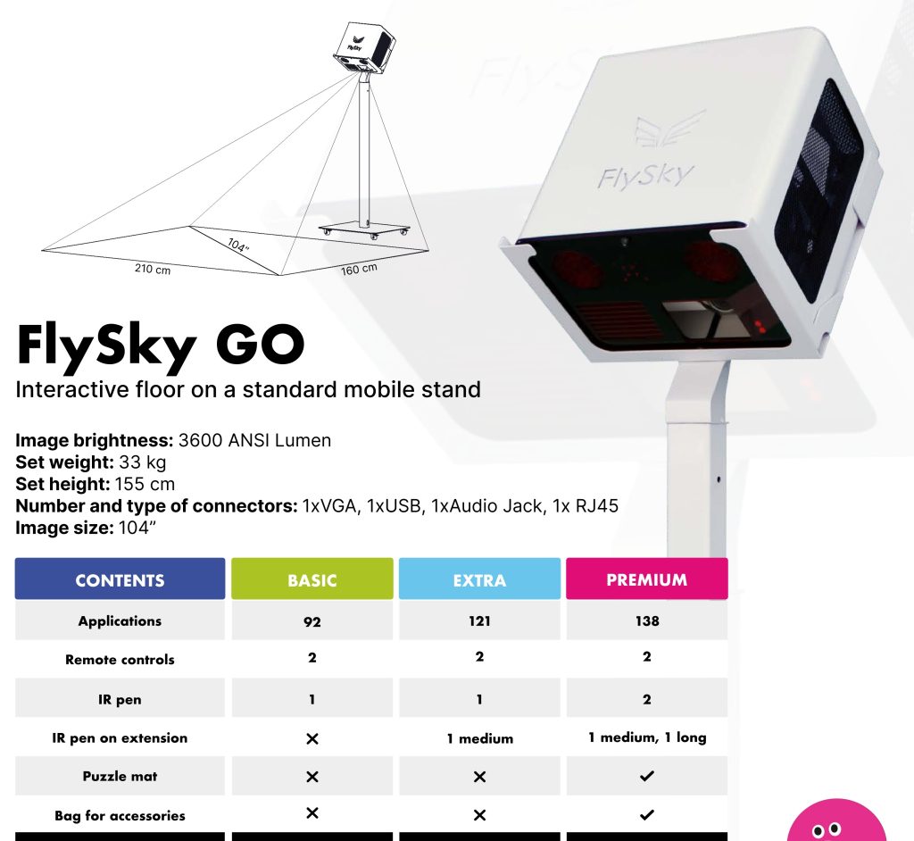 Το FlySky Διαδραστικό Πάτωμα είναι ένα ευέλικτο εργαλείο εκπαίδευσης, εξάσκησης και θεραπείας. Παρέχει μια ελκυστική και διαδραστική εμπειρία μάθησης μέσω του διαδραστικής επιφάνειάς του, που μπορεί να χρησιμοποιηθεί για διάφορα εκπαιδευτικά παιχνίδια και εφαρμογές. Προσφέρει μια ποικιλία εκπαιδευτικών παιχνιδιών που καλύπτουν διαφορετικά θέματα και στυλ μάθησης: Μαθηματικά Παιχνίδια, Γλωσσικά Παιχνίδια, Δραστηριότητες Επιστήμης και STEAM, Κουίζ και Trivia, Παιχνίδια Φυσικής Δραστηριότητας, Δημιουργικά και Καλλιτεχνικά Παιχνίδια, Επίλυση Προβλημάτων και Λογικά Παιχνίδια. Χρησιμοποιεί όλες τις αισθήσεις για να κάνει τη μάθηση, την εκπαίδευση και τη θεραπεία αξέχαστες και διασκεδαστικές, ενισχύοντας τη γνωστική περιέργεια και τη λογική σκέψη. Είναι ένα ευέλικτο εργαλείο που μπορεί να χρησιμοποιηθεί ως διαδραστικό δάπεδο και τραπέζι, καθιστώντας το προσαρμόσιμο σε διαφορετικά περιβάλλοντα και ανάγκες. Υποστηρίζει παιδιά με ειδικές εκπαιδευτικές ανάγκες παρέχοντας ένα κατάλληλο και ελκυστικό περιβάλλον εργασίας, το οποίο μπορεί να τροποποιηθεί για την επίτευξη θεραπευτικών στόχων. Το FlySky εξαλείφει τις καθυστερήσεις στην αλληλεπίδραση με τον χρήστη, προσαρμόζεται στις αλλαγές στο φωτισμό του δωματίου και αναγνωρίζει και εξαλείφει τις σκιές, εξασφαλίζοντας βέλτιστη ποιότητα εικόνας και εμπειρία χρήστη. Η έκδοση FlySky GO προσφέρει κινητικότητα, επιτρέποντάς του να μετακινείται εύκολα μεταξύ τάξεων ή διαφορετικών τοποθεσιών χωρίς να απαιτείται μόνιμη εγκατάσταση. Η έκδοση FlySky GO προσφέρει κινητικότητα, επιτρέποντάς του να μετακινείται εύκολα μεταξύ τάξεων ή διαφορετικών τοποθεσιών χωρίς να απαιτείται μόνιμη εγκατάσταση.