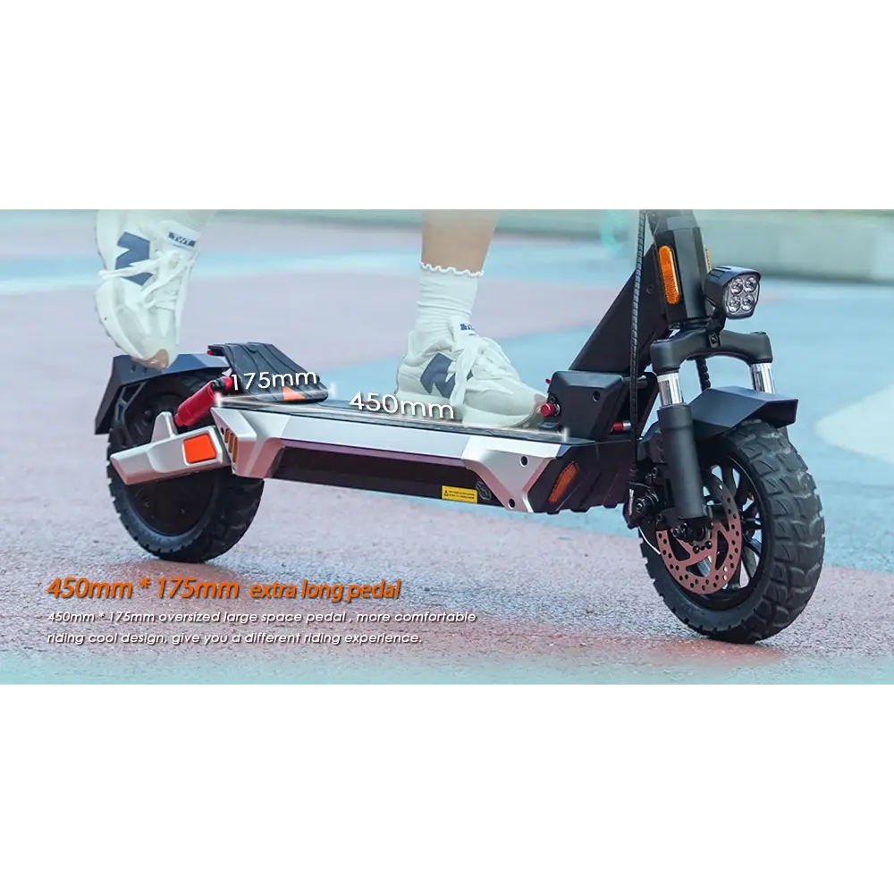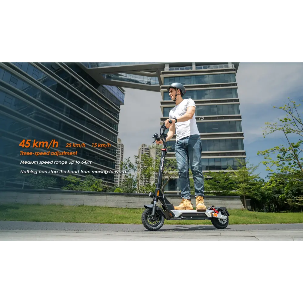 Το KuKirin M4 Max Ηλεκτρικό Πατίνι είναι ένα όχημα υψηλής απόδοσης σχεδιασμένο τόσο για μετακινήσεις στην πόλη όσο και για περιπετειώδεις ταξιδιώτες του Σαββατοκύριακου. Με κινητήρα χωρίς ψήκτρες 800W με μέγιστη ισχύ 1000W, φτάνει ταχύτητες έως και 45 χλμ/ω, καθιστώντας το ιδανικό για οδήγηση σε δρόμους της πόλης ή για μέτριες κλίσεις έως 20°. Η μπαταρία λιθίου 48V 18,2Ah προσφέρει εντυπωσιακή αυτονομία έως και 64 χλμ ανά φόρτιση, εξασφαλίζοντας ταξίδια μεγάλων αποστάσεων χωρίς συχνή επαναφόρτιση. Το σκούτερ διαθέτει ελαστικά 10 ιντσών χωρίς αέρα που προσφέρουν εξαιρετική πρόσφυση και απορρόφηση κραδασμών, που συμπληρώνονται από σύστημα ανάρτησης τεσσάρων βραχιόνων και διπλά δισκόφρενα για βελτιωμένη ασφάλεια και άνεση. Ανάλογα με τις ανάγκες τους, οι αναβάτες μπορούν να επιλέξουν από τρεις διαφορετικές λειτουργίες ταχύτητας: 15 χλμ/ω, 25 χλμ/ω και 45 χλμ/ω. Ένας μηχανισμός γρήγορης αναδίπλωσης με κλείδωμα ασφαλείας παρέχει εύκολη φορητότητα, ενώ το ευρύχωρο πεντάλ και το εύχρηστο ταμπλό προσφέρουν μια ομαλή και φιλική προς το χρήστη εμπειρία. Με ατμοσφαιρικό φωτισμό, φλας και προβολείς ευρείας δέσμης, το KuKirin M4 Max εξασφαλίζει ορατότητα και στυλ, μέρα ή νύχτα.