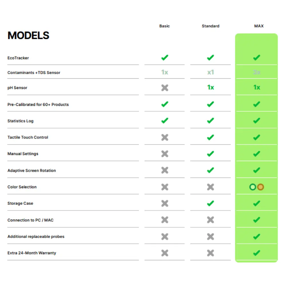 - Μοντέλα: EcoTracker Basic: Μόνο έλεγχος τροφίμων / EcoTracker Standard / Max: Προσθέτει έλεγχο νερού (TDS + pH).