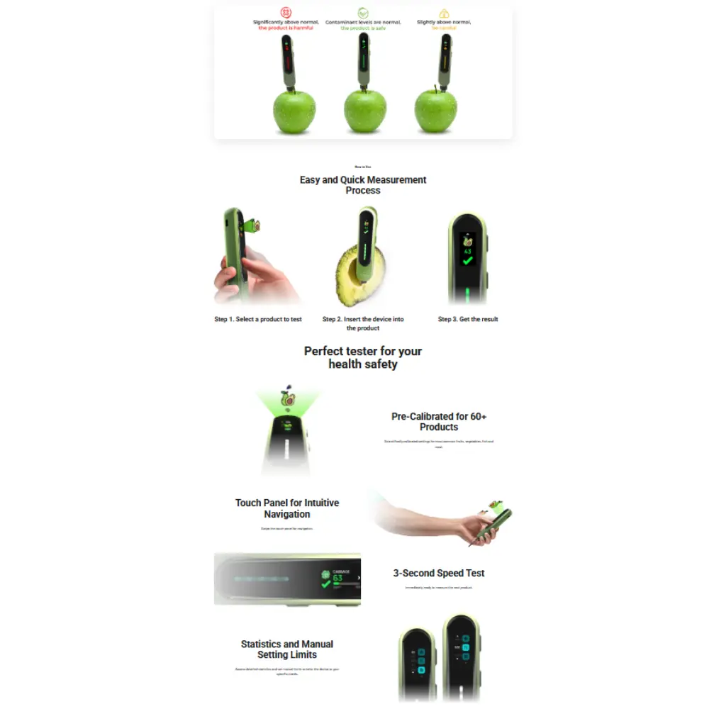 - Δοκιμή τροφίμων: Ανιχνεύει νιτρικά και κοινά χημικά υπολείμματα σε φρούτα, λαχανικά, κρέας και ψάρια.