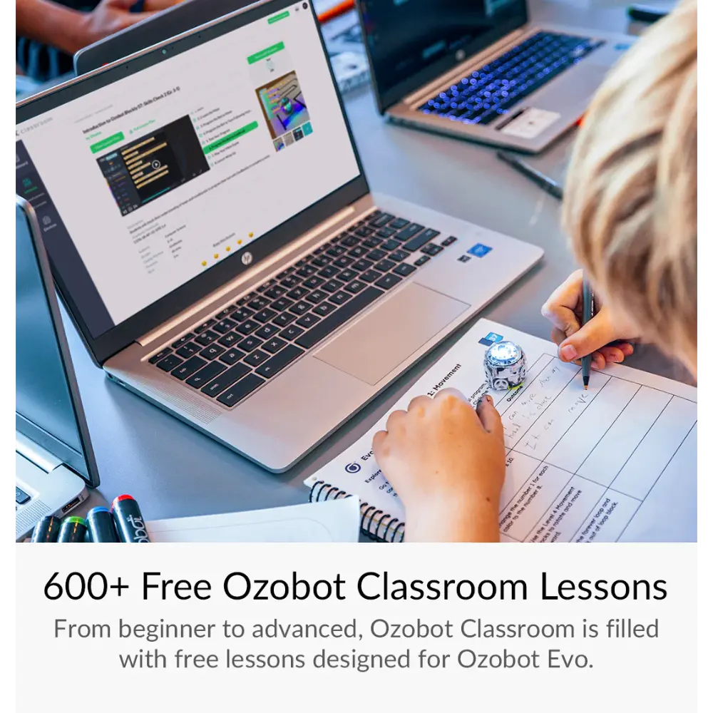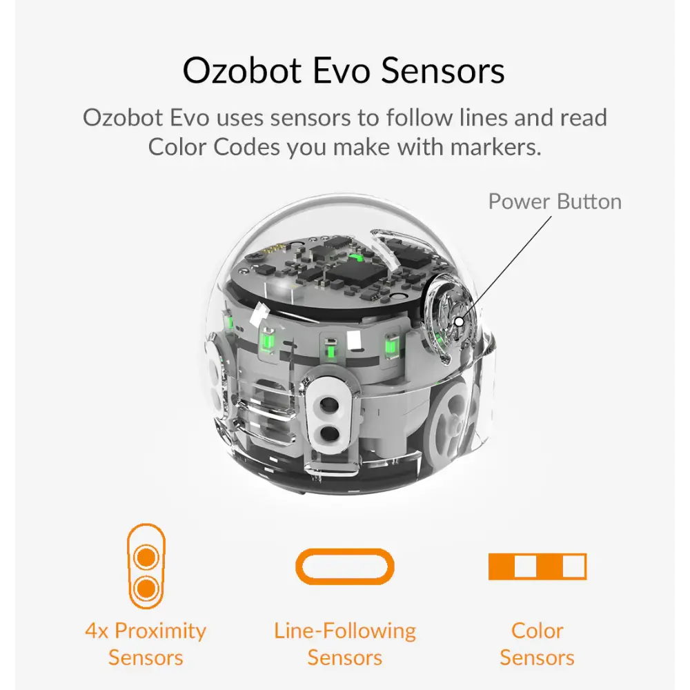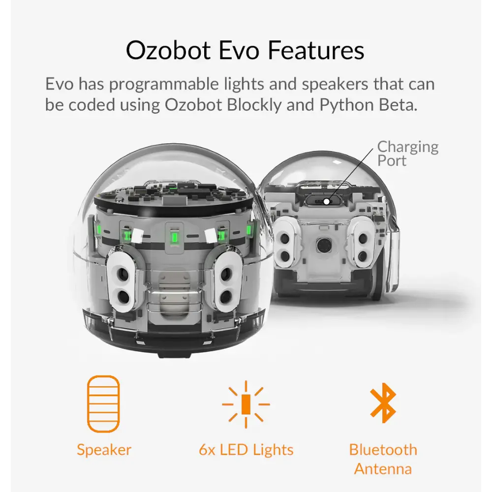 - Περιεχόμενα κιτ: 1 ρομπότ Evo, 1 καλώδιο φόρτισης micro-USB, 5 δείκτες χρωματικού κώδικα διπλής άκρης, 1 προστατευτική θήκη με φερμουάρ, Πρόσβαση σε διαδικτυακά μαθήματα και δραστηριότητες