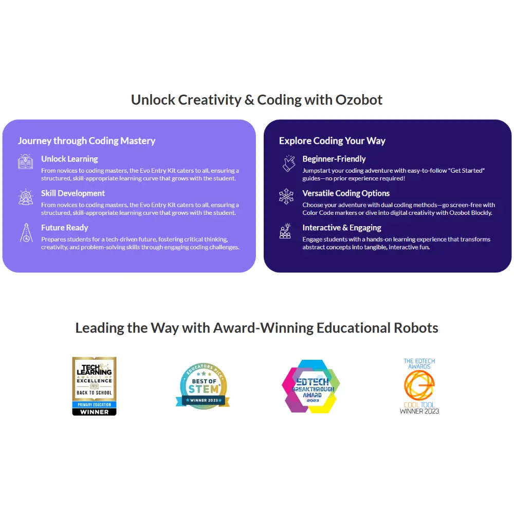 - Επιλογές προγραμματισμού: OzoBlockly (οπτική κωδικοποίηση drag-and-drop με 5 επίπεδα δεξιοτήτων), Κωδικοποίηση χωρίς οθόνη χρησιμοποιώντας δείκτες Χρωματικών Κωδικών