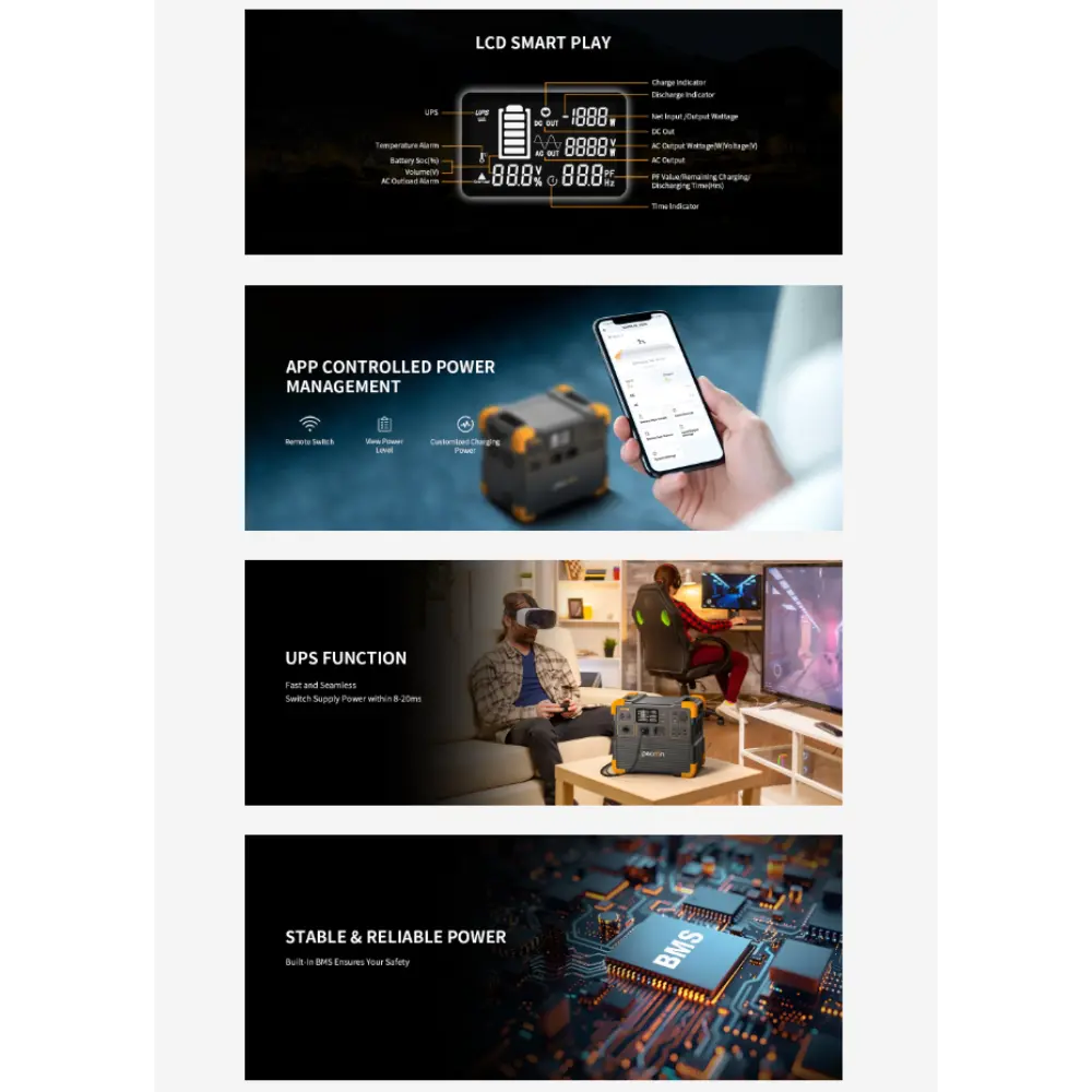• Βασικά χαρακτηριστικά: Δυνατότητα ρύθμισης της ταχύτητας φόρτισης, έλεγχος APP, τηλεχειριστήριο Wi-Fi, λειτουργία UPS, έξοδος XT60 30A (12V), υπερταχεία φόρτιση 1,5 ώρας, επεκτάσιμη έως 8192Wh, μέγιστη ηλιακή ισχύς 800W (GX16MF+DC5521)