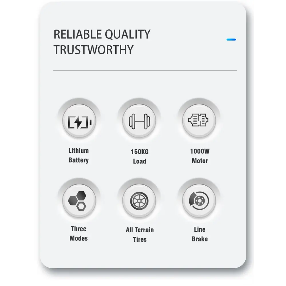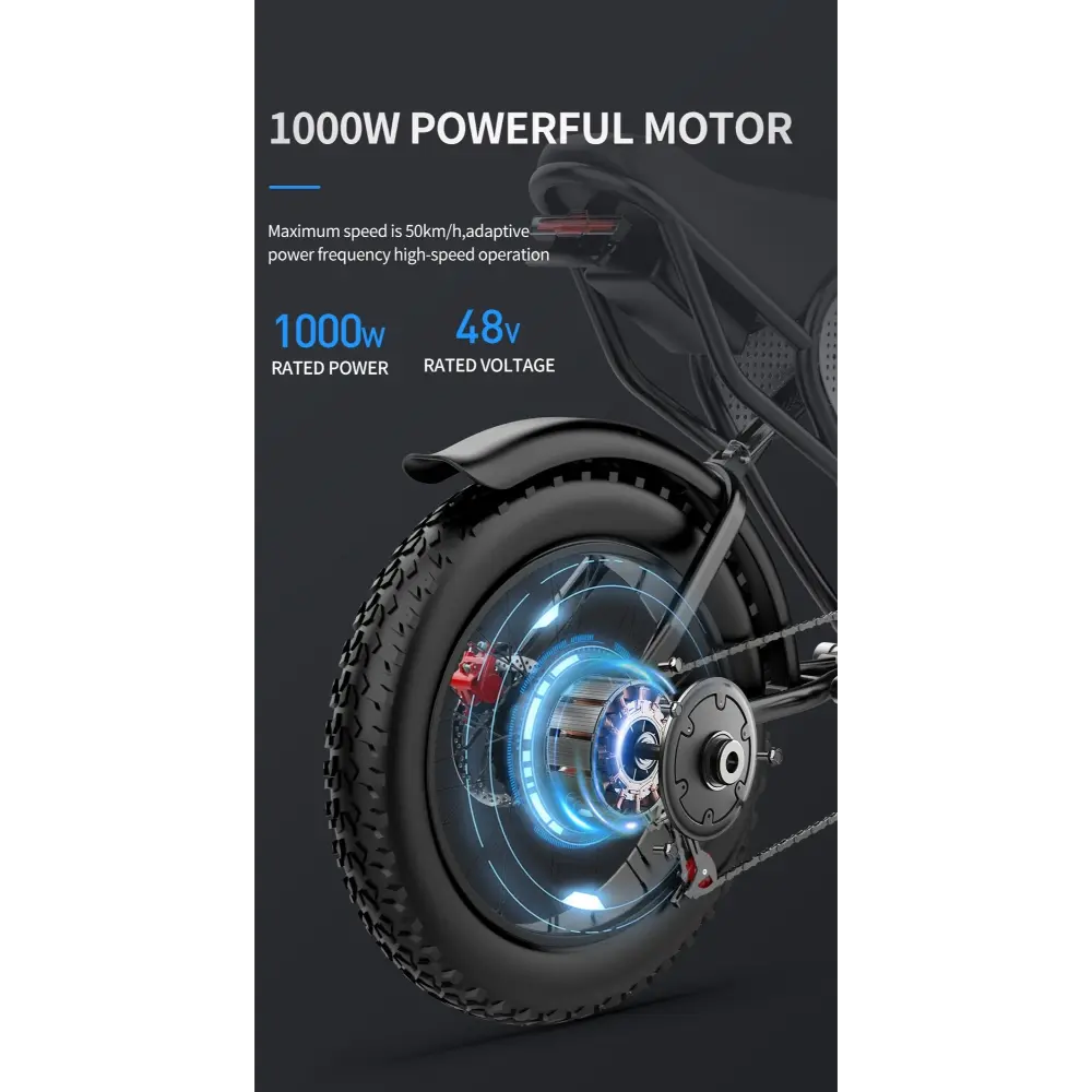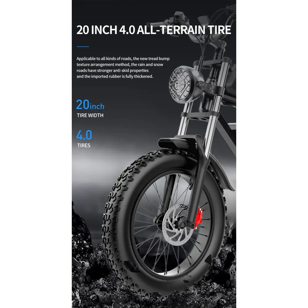 Το Ridstar Q20 Ηλεκτρικό Ποδήλατο Παντός Εδάφους είναι ένα ανθεκτικό, υψηλής απόδοσης ηλεκτρικό ποδήλατο σχεδιασμένο τόσο για αστικές μετακινήσεις όσο και για περιπέτειες εκτός δρόμου. Τροφοδοτείται από έναν ισχυρό κινητήρα χωρίς ψήκτρες 1000W, προσφέροντας εντυπωσιακή ροπή και επιτάχυνση, φτάνοντας ταχύτητες έως και 50 χλμ/ω. Η μπαταρία λιθίου 48V 20Ah προσφέρει μεγάλη αυτονομία – έως και 120 km σε λειτουργία υποβοήθησης πεταλιών – καθιστώντας το ιδανικό για ταξίδια μεγάλων αποστάσεων. Κατασκευασμένο με ανθεκτικό πλαίσιο από κράμα αλουμινίου, το Q20 διαθέτει ελαστικά 20×4,0 ιντσών που παρέχουν εξαιρετική πρόσφυση σε ποικίλα εδάφη, όπως χιόνι, άμμο και βραχώδη μονοπάτια. Το κιβώτιο ταχυτήτων 7 ταχυτήτων Shimano σας παρέχει ευέλικτο έλεγχο και η διπλή ανάρτηση (εμπρός και πίσω) εγγυάται άνετη οδήγηση. Η ασφάλεια ενισχύεται με διπλά υδραυλικά δισκόφρενα, φωτισμό LED και οθόνη LCD που παρακολουθεί την ταχύτητα, τη διάρκεια ζωής της μπαταρίας και τα χιλιόμετρα σε πραγματικό χρόνο. Με τον κομψό σχεδιασμό του, την άνετη φαρδιά σέλα και τις πολλαπλές λειτουργίες οδήγησης —συμπεριλαμβανομένων αμιγώς ηλεκτρικών, υποβοήθησης πεταλιών και χειροκίνητων— το Ridstar Q20 συνδυάζει άψογα τη δύναμη, το στυλ και την πρακτικότητα σε μία συναρπαστική διαδρομή.