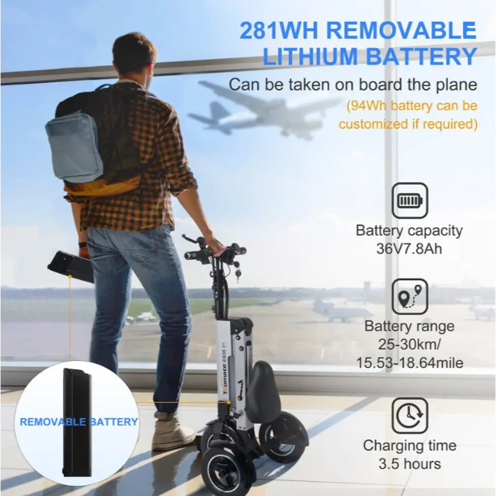 • Αναδιπλούμενο: Ναι – συμπαγής σχεδιασμός τρίκυκλου, φιλικό προς τις αεροπορικές εταιρείες